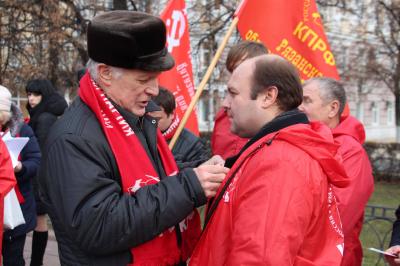 Затем слово взяли Л.М. Кривцова - первый секретарь Октябрьского РК КПРФ, член президиума ВЖС "Надежда России"; Е.Н. Морозов - первый секретарь Рязанского обкома Комсомола; М.М. Крючков - доктор наук, профессор РГАТУ; А.В. Ворнаков – слесарь авиаремонтного завода; П.И. Пыленок - первый секретарь Московского РК КПРФ, руководитель фракции КПРФ в Рязанской городской Думе. В заключение была единогласно принята резолюция с требованиями: смены политического курса в России в интересах всех граждан; смены либерального Правительства Медведева на Правительство народного доверия; возврата народу прав и гарантий, завоёванных Великим Октябрём, которую зачитал секретарь Рязанского обкома КПРФ, депутат Рязанской городской Думы Д.С. Сидоров.