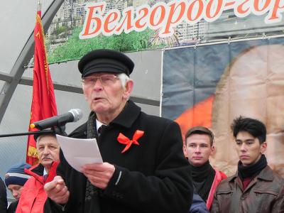 На митинге, посвящённом юбилею Октябрьской революции, выступили первый секретарь Белгородского обкома КПРФ В.А. Шевляков, первый секретарь Ровеньского райкома партии Н.Л. Нитепин, профессор, член-корреспондент РАЕН А.И. Артёменко, Федеральный комсорг по ЦФО Анастасия Байбикова, водитель большегрузного автомобиля, депутат Совета Губкинского городского округа от КПРФ И.Г. Орлов. Они говорили о том, что дала Октябрьская революция в разных сферах жизни людей, и что потерял народ от торжества – временного, в этом высказали убеждённость все выступавшие – контрреволюции.