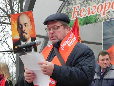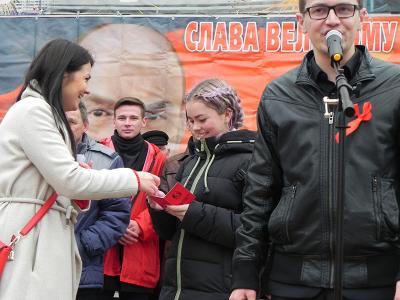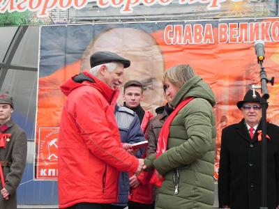 Здесь же, на митинге, были вручены партийные и комсомольские билеты группе белгородцев, вступивших в КПРФ и ЛКСМ РФ по призыву в честь юбилея Октябрьской революции.