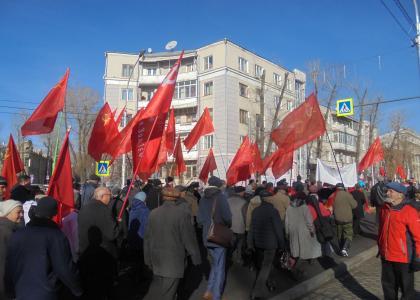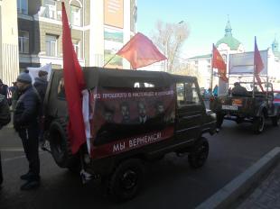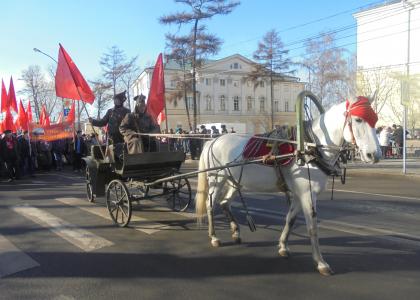 Затем, сформировав колонну, участники мероприятия двинулись по улице Карла Маркса к памятнику В.И. Ленину, где состоялся митинг-концерт. Во главе колонны ехала тачанка с экипажем из красноармейца и матроса «Авроры», в образе которых предстали иркутские коммунисты.