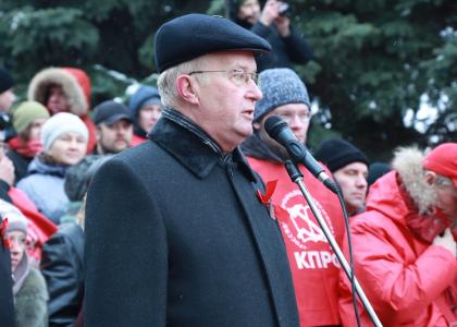 Второй секретарь обкома КПРФ Андрей Алехин приветствует участников митинга и предоставляет слово первому секретарю Омского областного комитета КПРФ, депутату Государственной думы Александру Кравцу, который в своем выступлении отметил, что уроки Великого Октября вновь актуальны для России. Социально-экономическая ситуация в нашей стране близка к критической. Власть и единороссы ведут планомерное наступление на права трудящихся, вводят новые налоги и поборы, готовят к приватизации высокодоходные и государствообразующие активы.