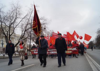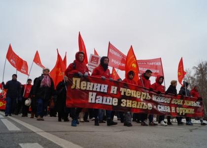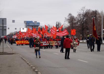 Все делегации фотографировались с лидером КПРФ области Казанцевой Т.Н. Во главе колонны шли комсомольцы с транспарантом, на котором были начертаны строчки из поэмы В. Маяковского« В.И. Ленин» - Ленин и теперь живее всех живых, наше знамя, сила и оружие! Колонна была праздничной и нарядной, флаги КПРФ, лозунги и призывы, а также шары, надутые гелием реяли над колонной. Впереди следовал агитмобиль КПРФ, с установкой, из которой звучали партийные, революционные песни, призывы, приветствия и поздравления. Музыкальное оформление осуществлял Беломоев Алексей, у которого все получилось просто здорово! Над колонной звучало многократное «Ура»! На Центральной площади колонна повернула к памятнику В.И. Ленина, где стояла сборная сцена, оформленная баннерами с праздничной тематикой. Первой на митинге выступила первый секретарь Тюменского обкома КПРФ Казанцева Тамара Николаевна. Ее выступление публикуется ниже. Также в числе выступающих были депутаты Тюменской областной Думы Юрий Юхневич и Сергей Левченко, помощник депутата Государственной Думы Дорохина П.С. Юрий Дранчук.