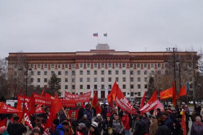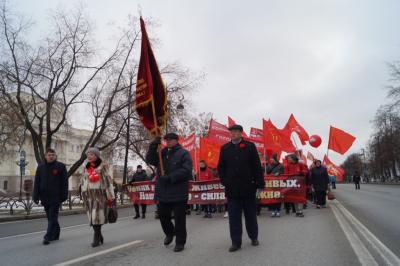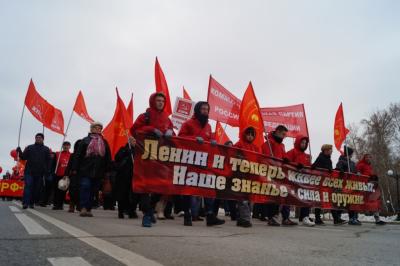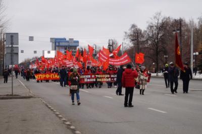 Все делегации фотографировались с лидером КПРФ области Казанцевой Т.Н. Во главе колонны шли комсомольцы с транспарантом, на котором были начертаны строчки из поэмы В. Маяковского« В.И. Ленин» - Ленин и теперь живее всех живых, наше знамя, сила и оружие! Колонна была праздничной и нарядной, флаги КПРФ, лозунги и призывы, а также шары, надутые гелием реяли над колонной. Впереди следовал агитмобиль КПРФ, с установкой, из которой звучали партийные, революционные песни, призывы, приветствия и поздравления. Музыкальное оформление осуществлял Беломоев Алексей, у которого все получилось просто здорово! Над колонной звучало многократное «Ура»! На Центральной площади колонна повернула к памятнику В.И. Ленина, где стояла сборная сцена, оформленная баннерами с праздничной тематикой. Первой на митинге выступила первый секретарь Тюменского обкома КПРФ Казанцева Тамара Николаевна. Ее выступление публикуется ниже. Также в числе выступающих были депутаты Тюменской областной Думы Юрий Юхневич и Сергей Левченко, помощник депутата Государственной Думы Дорохина П.С. Юрий Дранчук.