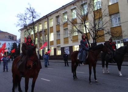Колонну демонстрантов по традиции открывала конница в красноармейской форме, в будёновках. В первых рядах шли комсомольцы и молодежь, которой ближе алый цвет знамен Коммунистической партии, чем каких-либо других.