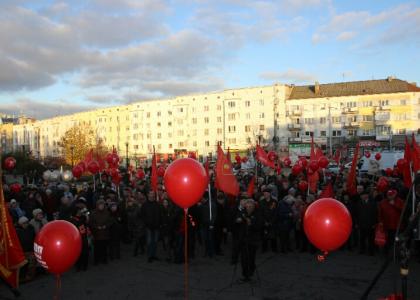 Как сказала Наталья Комиссаренко, представлявшая восток области, благодарю Октябрю стали возможными все наши небывалые победы, красный флаг надрейхстагом и первый полет человека в космос.Но в 1991 году наше государство было варварски разрушено. Сейчас мы занимаем 91 место по уровню жизни, за годы «демократии и рынка» было закрыто 85 тыс. промышленных предприятий, миллионы потеряли работу. «Власть должна принадлежать нам, пролетариям», - закончила свое выступление Наталья.