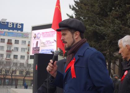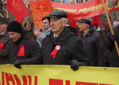 После митинга колонна под звуки духового оркестра направилась на Комсомольскую площадь. Шествие сопровождалось революционными маршами и песнями советских времен. Многие прохожие останавливались и подхватывали дружное коммунистическое "Ура!", а некоторые присоединялись к краснознаменной колонне.