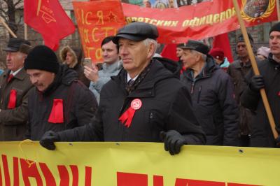 После митинга колонна под звуки духового оркестра направилась на Комсомольскую площадь. Шествие сопровождалось революционными маршами и песнями советских времен. Многие прохожие останавливались и подхватывали дружное коммунистическое "Ура!", а некоторые присоединялись к краснознаменной колонне.