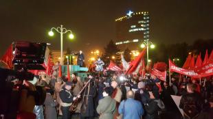 Взмывали в хмурое, сырое ноябрьское небо мощные, волнующие звуки духовых оркестров, как бы перенося нас в те времена, когда старые марши «Варшавянка» и «Смело, товарищи, в ногу!» были повседневными песнями бойцов революционной красной гвардии. Люди скандировали лозунги "Да здравствует Великая Октябрьская социалистическая революция!", "Вся власть Советам!", "Великому Октябрю слава!", "Заводы - рабочим! Земля - крестьянам! Лаборатории - ученым!", "Природные богатства в собственность народа!", "Социализму - да! Капитализму - нет!", "Мировому капиталу - мировой порядок!", "Выход из кризиса империалистическая война или социалистическая революция!", "Россия без буржуев, Россия для рабочих!".