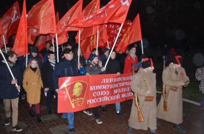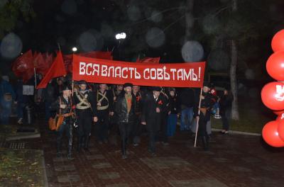 7 ноября, вечером (к сожалению, эта дата пока еще не стала красным днем календаря, чего добиваются коммунисты, поэтому приходится ждать окончания трудового дня), сотни ростовчан в едином стремлении, плечом к плечу прошли с развевающимися над колонной демонстрантов красными флагами и устремляющимися ввысь гирляндами воздушных шаров - от памятника В.И. Ленину на Большой Садовой по Пушкинскому бульвару до Театральной площади. Прошли, чтобы напомнить всем, как в этот день 100 лет тому назад в истории человечества открылась новая дорога.