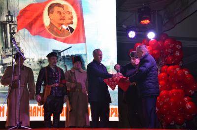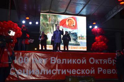 Праздничный митинг-концерт, сопровождался реконструкцией событий 25 октября 1917 года с революционными солдатами и матросами, бронетехникой. На развернутом экране демонстрировались кадры исторической кинохроники, а на сцене выступали артисты.