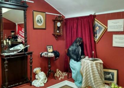 - художественную инсталляцию, отражающую основную идею выставки, – коренной перелом в жизни общества, слом привычных устоев для одних и борьба за «лучшую жизнь» других. Экспозиция символически разделена на две части: фрагмент обстановки дома разночинной интеллигенции и кабинета революционного штаба через соответствующую атрибутику;