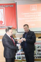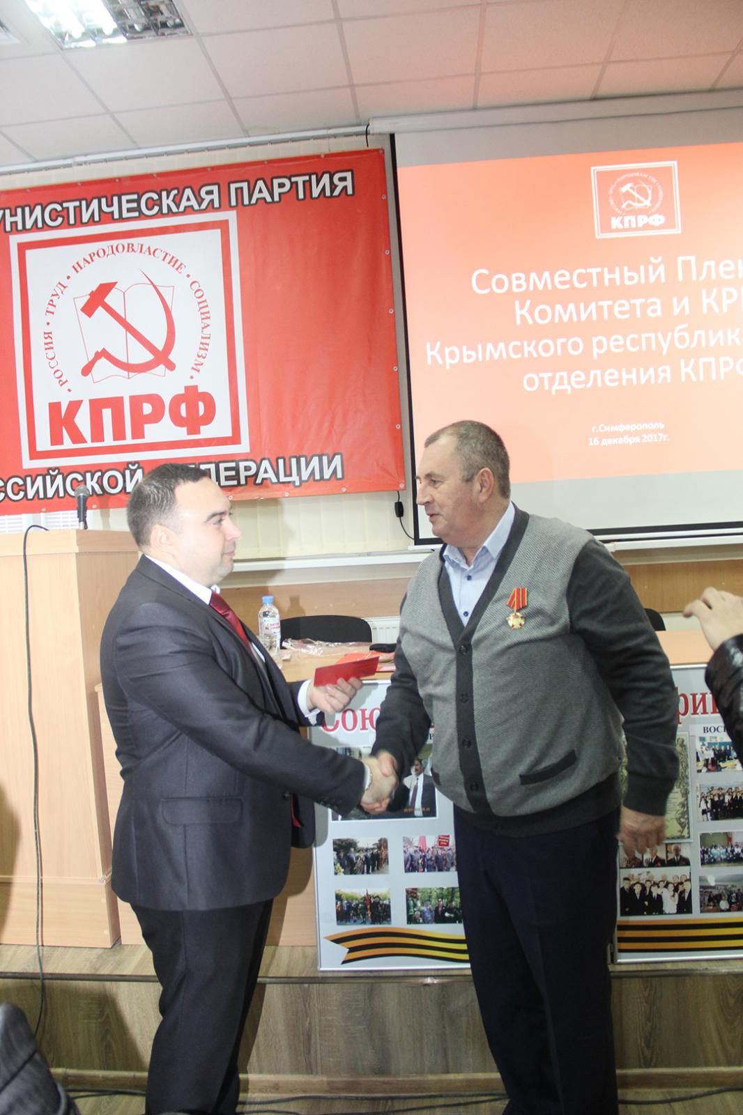После открытия Пленума первый секретарь комитета Сергей Богатыренко вручил юбилейные медали «100 лет Великой Октябрьской социалистической революции» министру экологии и природных ресурсов Республики Крым Геннадию Нараеву, заместителю председателя Счетной палаты Республики Крым Алексею Тихомирову, первому секретарю Ялтинского городского отделения КПРФ Ивану Павличенко и первому секретарю Симферопольского городского отделения КПРФ Степану Кискину.
