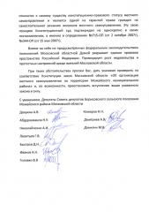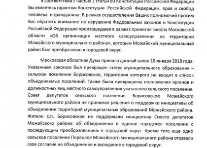 В связи с этим, депутаты Совета депутатов с.п. Борисовское обратились к Президенту РФ Путину с просьбой проверить на соответствие Конституции закон Московской области «Об организации местного самоуправления на территории Можайского муниципального района» и остановить вступление выше указанного закона в силу.
