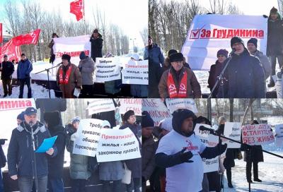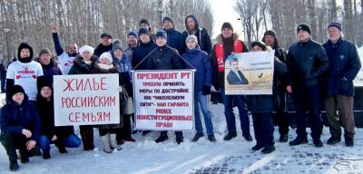 Открывая митинг, ведущий Алексей Серов, первый секретарь Казанского горкома КПРФ отметил, что в этот же день в Москве проходит съезд обманутых дольщиков России, и инициативная группа из Татарстана присутствует на нем, он также поблагодарил автоперевозчиков Казани за техническую помощь в организации мероприятия.