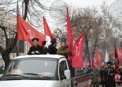 По улице Красной – от краевой филармонии до здания Законодательного Собрания края – прошла праздничная колонна, над которой развевались знамена родов войск и Победы, флаги КПРФ, ЛКСМ и Союза советских офицеров.