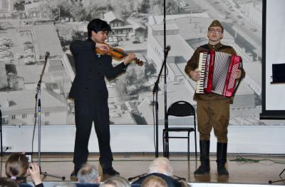 После официальной, торжественной части собрания, состоялся праздничный концерт. Перед его участниками, в первой части программы, выступили челябинские артисты из народа – Виктор Грешняков и Александр Царьков. Они, под аккомпанемент аккордеона, мастерски, исполнили песни: «Я служу на границе», «Вечер на рейде» и «Хотят ли русские войны». При звенящей тишине зал слушал в исполнении Руслана Шафиков (скрипка) и Александра Царькова (аккордеон) щемящую мелодию «На безимянной высоте».