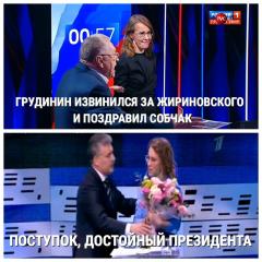 Кандидат в президенты России от КПРФ и народно-патриотических сил России Павел Грудинин во время дебатов на Первом канале извинился перед Ксенией Собчак «от лица всех мужчин» за оскорбления от одного из кандидатов. «И тут как-то один из присутствующих здесь кандидатов обидел ее и до сих пор не извинился. Я считаю, что все мужчины, которые стоят здесь, тоже причастны, к сожалению, к такой неприятной вещи как обида Ксении Анатольевны. От лица всех мужчин я хочу извиниться перед ней»,— сказал Грудинин.