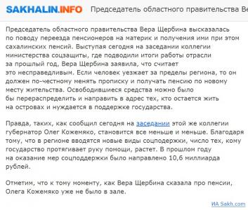 Информационное агенство SAKH.INFO распространило заявление председателя правительства Сахалинской области Веры Щербины, в котором говорится о том, что «это несправедливо, когда наши жители уезжают с островов и продолжают получать сахалинскую пенсию».