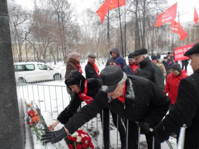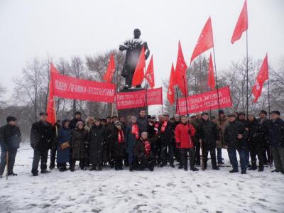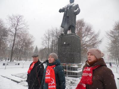 Не смотря на неожиданно вернувшуюся зиму со снегопадом и метелью, митинг, организованный Пермским крайкомом КПРФ, прошёл ярко и звучно. Торжественная колонна под звуки песни «Ленин всегда живой», с транспарантами и флагами, прошла по театральной аллее к площадке перед памятником, где участниками были возложены цветы к монументу Ильичу. Лозунги на красных полотнищах гласили: