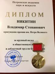 Перед этим Президент академии Воронцов А.В. вручил Никитину В.С. Диплом о присвоении звания академика ПАНИ и Диплом лауреата премии имени Петра Великого за крупный вклад в общественную жизнь и доблестный труд во благо России с вручением медали академии «За верность России». Доклад Никитина В.С. был выслушан с большим вниманием и вызвал одобрение у слушателей. Никитин ответил на множество вопросов из зала, после чего состоялась живая дискуссия, в которой приняли участие академики. В итоге В.С. Никитина пригласили выступить перед студентами и патриотическим активом ряда вузов и общественных организаций Санкт-Петербурга.