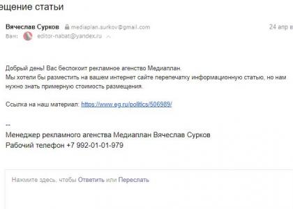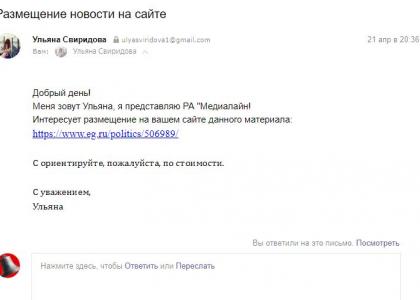 БИРОБИДЖАН, 28 АПРЕЛЯ, «НАБАТ». — 21 апреля, суббота. Со дня выборов президента России минуло больше месяца. Но неожиданно на электронную почту интернет-газеты «Набат» приходит письмо, автор которого некая Ульяна Свиридова, представившись сотрудником рекламного агентства «Медиалайн», предлагает разместить за деньги на сайте нашего издания заказной материал. К электронному сообщению прилагается гиперссылка на статью.