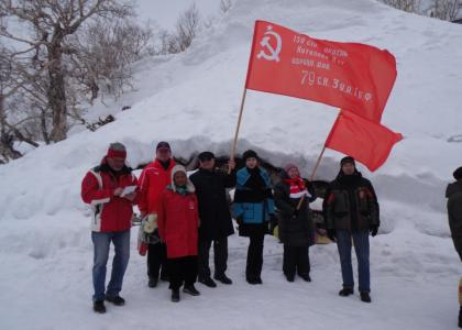 Затем, преодолевая суровые климатические условия, колкий снег и ветер, цепочка участников тронулась в путь - покорять вершину горы. Коммунисты пронесли по этому непростому пути и водрузили на пике Знамя Победы, Знамя ВЛКСМ и флаг КПРФ, тем самым поставив символическую точку в конце истории, написанной кровавыми чернилами войны.