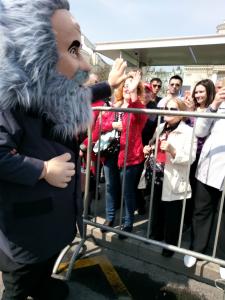 Мысль пригласить Карла Маркса на шествие КПРФ принадлежит участникам творческой группы "Красный ёж", которая регулярно проводит яркие политические перформансы на митингах и шествиях КПРФ.