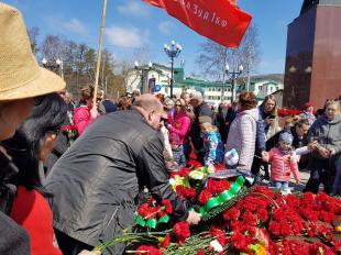 Коммунисты, члены КПРФ, несли флаги, цветы и памятный венок, возложив их у мемориального комплекса, созданного в честь советских воинов, павших в боях за освобождение Южного Сахалина и Курильских островов от японских милитаристов в августе 1945 года. Под красными флагами шли руководители сахалинского областного комитета КПРФ, южносахалинского отделения, рядовые коммунисты и сторонники партии.