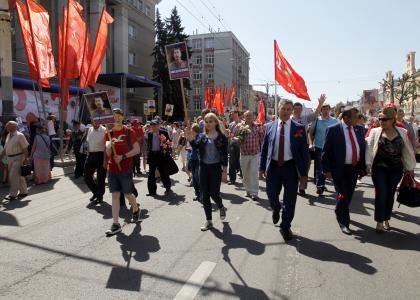 красных знамён, другой советской символики несут люди в колоннах бессмертного