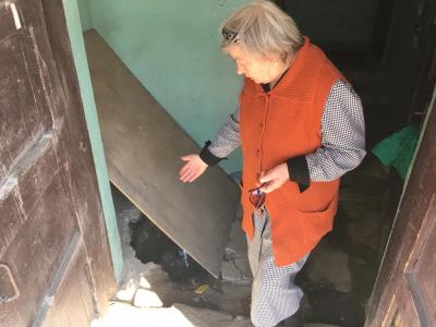 входе в подъезд - жильцы прикрыли ее фанерой, чтобы не проваливались дети.