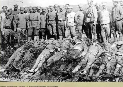Жестокость «белочехов»: «…порою не знала предела. Известен расстрел 16 из 37 арестованных женщин, виновных лишь в том, что они захоронили выброшенные Волгой трупы. Остальные избежали этой участи только благодаря побегу, при котором погибло ещё 7 женщин».