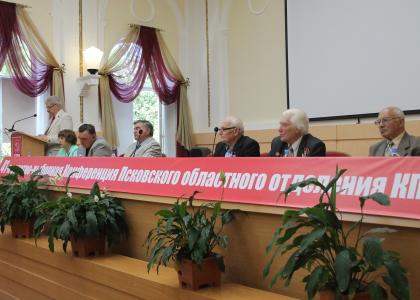 В Президиуме конференции были: член ЦК КПРФ, первый секретарь Комитета Псковского областного отделения КПРФ П.В.Алексеенко; член бюро обкома КПРФ, почётный председатель правления ПРОО «Дети войны» Г.Н.Бубнов; второй секретарь Комитета Псковского областного отделения КПРФ, главный редактор газеты «Псковский рубеж» В.Ф.Дуля; Редактор телеканала «Студия Альфа», почётный гражданин Дедовического района В.И.Гей; председатель КРК Псковского областного отделения КПРФ В.М.Жигирев; секретарь Комитета Псковского областного отделения КПРФ, председатель правления ПРОО «Дети войны» А.П.Копосов и член ЦК КПРЫ, член обкома КПРФ, основатель движения «Русский Лад» В.С.Никитин. На конференции также присутствовали члены и сторонники партии, представители СМИ и общественных организаций.