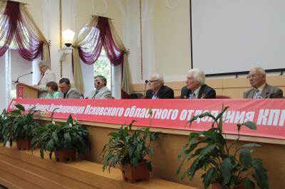 В Президиуме конференции были: член ЦК КПРФ, первый секретарь Комитета Псковского областного отделения КПРФ П.В.Алексеенко; член бюро обкома КПРФ, почётный председатель правления ПРОО «Дети войны» Г.Н.Бубнов; второй секретарь Комитета Псковского областного отделения КПРФ, главный редактор газеты «Псковский рубеж» В.Ф.Дуля; Редактор телеканала «Студия Альфа», почётный гражданин Дедовического района В.И.Гей; председатель КРК Псковского областного отделения КПРФ В.М.Жигирев; секретарь Комитета Псковского областного отделения КПРФ, председатель правления ПРОО «Дети войны» А.П.Копосов и член ЦК КПРЫ, член обкома КПРФ, основатель движения «Русский Лад» В.С.Никитин. На конференции также присутствовали члены и сторонники партии, представители СМИ и общественных организаций.