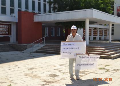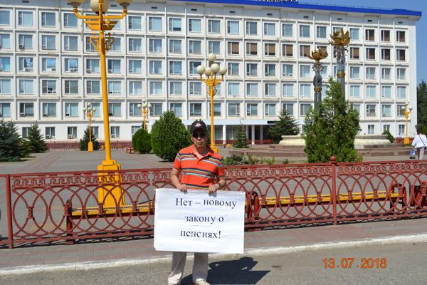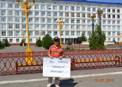 Пикетчики с плакатами «Нет пенсионной реформе!», «Господдержку – пенсионерам, а не олигархам!», «На пенсию – вперед ногами?!», «Хочу дожить до пенсии!», «Реформа пенсий бесчеловечна!» расположились на центральной площади Элисты, напротив здания Правительства республики, у зданий КалмГосуниверситета, республиканского архива. Одиночные пикеты состоялись как раз в то время, когда проходила тридцать седьмая (внеочередная) сессия Народного Хурала (парламента) Республики Калмыкия пятого созыва, на которой, кроме всего прочего, рассматривался вопрос по пенсионной реформе.
