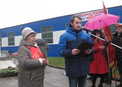 Перед началом митинга к обелиску возложили цветы и почтили память погибших депутаты КПРФ в Ярославской областной Думе и муниципалитете Ярославля Александр Воробьев, Евгения Овод и Наталия Бобрякова.