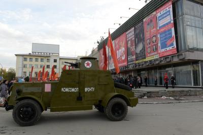 входа в киноконцертный зал стоят броневики. Их пригнали бывшие комсомольцы,