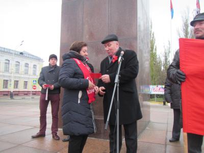 П.Н. Савилов, член обкома КПРФ, коммунист Ленинского РО КПРФ, в своём выступлении обратился к молодому поколению: «Вы сегодня вместе с нами участвуете в митинге, для вас уготовлена участь рабов при чужом капитале. Вы не можете получить качественное образование или медицинские услуги, в лучшем случае вам позволят батрачить за копейки, чтобы выжить. Великий Октябрь для вас должен быть путеводной звездой, примером того, что, сплотившись, рабочий класс может взять власть в свои руки и построить справедливое общество – созидателей».