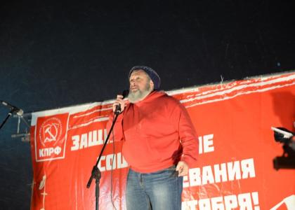 Об опыте революции для современного поколения порассуждал со сцены представитель «Партии дела» Олег Викторович. Он отметил, что сегодня правительство пытается заретушировать значимость Великого Октября, удушая народ убийственными реформами.