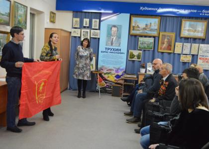 Зажигательное выступление Ксении с рассказом о современных комсомольцах и деятельности КПРФ закончилось тем, что пришедшие на выставку сфотографировались с флагом ЛКСМ РФ.