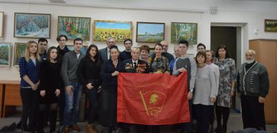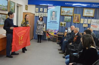 Зажигательное выступление Ксении с рассказом о современных комсомольцах и деятельности КПРФ закончилось тем, что пришедшие на выставку сфотографировались с флагом ЛКСМ РФ.