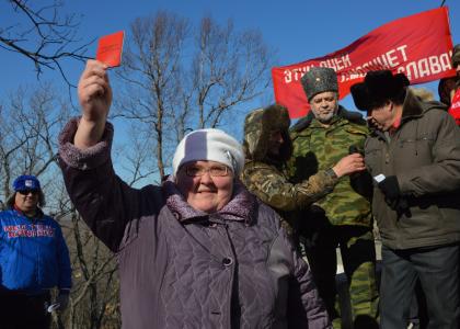 Наконец, последним пунктом красного автопробега стало село Волочаевка. Здесь у подножия легендарной сопки Июнь-Корань встретились делегации коммунистов ЕАО, Хабаровского и Приморского краёв. Построившись в колонну и развернув кумачовые знамёна и транспаранты, участники акции дружно поднялись на вершину.