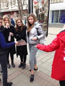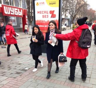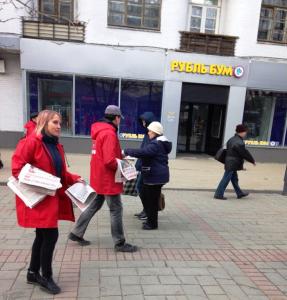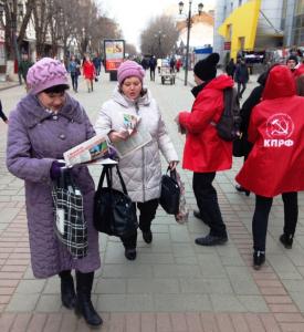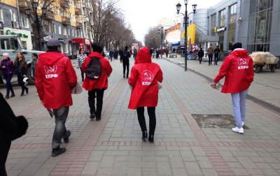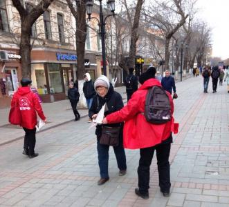 Молодые люди в красных кепках и накидках с символикой КПРФ, раздавали спецвыпуск партийной газеты "Коммунист. Думские баррикады", где отражена критическая позиция КПРФ по губительной политики антинародной власти, росту цен и тарифов на ЖКУ, поборов за капремонт и ОДН, увеличивающейся безработицы и углубляющегося социально-экономического кризиса, а также предложены пути выхода страны из исторического тупика.