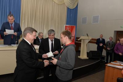 По традиции в начале работы Пленума нескольким десяткам новосибирцев были вручены партбилеты. Одним из первых партбилет из рук первого секретаря Новосибирского обкома КПРФ, мэра Новосибирска Анатолия Локтя получил теперь уже коммунист Артем Банных из Дзержинского отделения КПРФ.