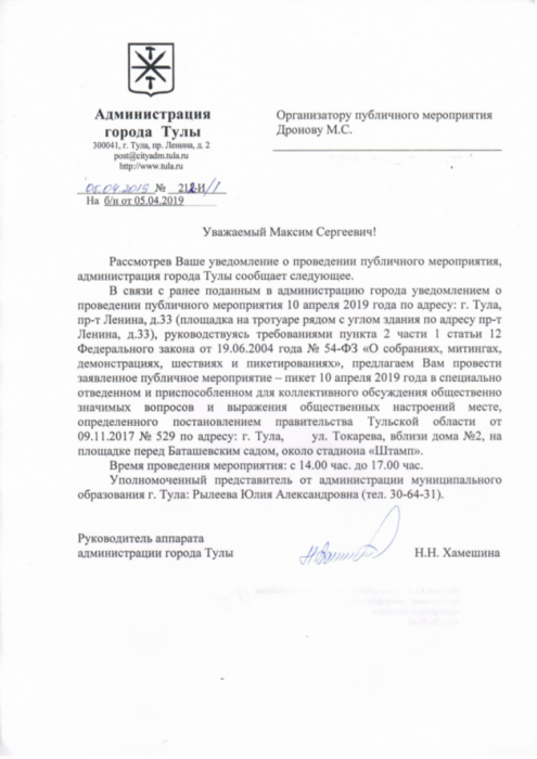 Администрация Тулы, где засели партфункционеры «Единой России», в письме за подписью руководителя аппарата Натальи Хамешиной в очередной раз издевательски отказала в согласовании. Организаторам дежурно сообщили о том, что в указанных ими местах якобы ранее уже были заявлены другие мероприятия, которых в итоге, естественно, не было, и отправили пикетировать старый разрушенный стадион «Штамп» на окраине Баташёвского сада между Зареченским и Пролетарским районами, где крайне низкая проходимость людей. Ранее в это "специально отведённое место" чиновники уже отправляли митинги против пенсионной и мусорной реформ, а также пикеты за сохранение территориальной целостности России, против передачи Курил Японии.