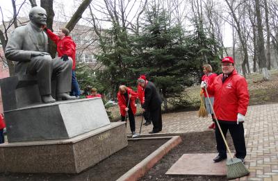 уборке городского парка, где установлен памятник В.И. Ленину, отметили 100-летие первого коммунистического