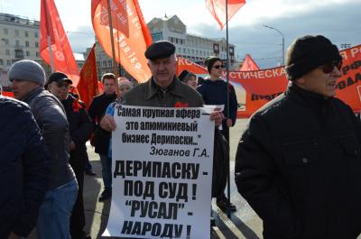 В 8.30 колонна под красными знаменами начала движение от площади Октября к памятнику В.И. Ленину на главной площади краевой столицы, где состоялся торжественный митинг. Демонстранты несли как традиционные первомайские плакаты, так и плакаты, отражающие актуальную политическую повестку дня: в поддержку Председателя ЦК КПРФ Геннадия Зюганова, подвергшегося судебному преследованию со стороны олигарха Дерипаски.