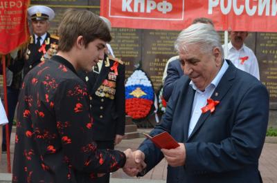 На митинге вручали партийные билеты вступившим в ряды КПРФ, и медали ЦК КПРФ «75 лет освобождения Крыма и Севастополя» заслуженным активистам.