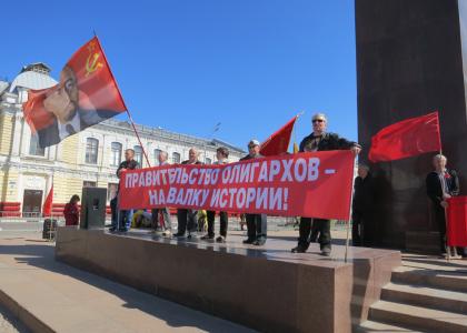 В это время по ул. Советской на праздник, организованный властью, прошли колонны так называемых профсоюзов, по факту состоящих на службе у буржуазии и являющихся не чем иным, как предателями интересов рабочего класса. Шествие «завербованных» на акцию работников различных бюджетных предприятий возглавила «ЕР» и её сателлиты - «СР» и ЛДПР. К слову, из провластных колонн значительная часть участников стала разбегаться сразу же после получения отметки о явке на праздник. Их путь пролегал через площадь, носящую имя вождя мирового пролетариата, где в это время разворачивался настоящий первомайский митинг КПРФ.