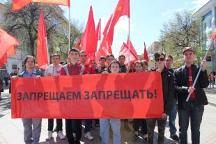В 11.30 стройная колонна КПРФ начала движение к драматическому театру. Впереди товарищи с растяжкой: «Правительство в отставку! Реформы отменить!». Далее комсомольцы с транспарантом: «Запрещаем запрещать».
