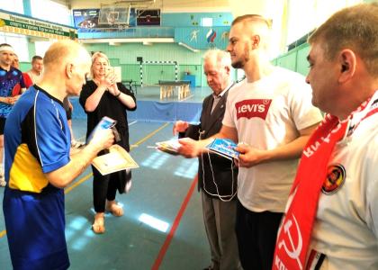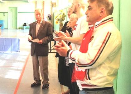 Коммунисты участвуют в организации турнира не первый раз. На одном из них руководитель фракции КПРФ областной Думы В.А.Кислицын вручил организаторам копию Знамени Победы.